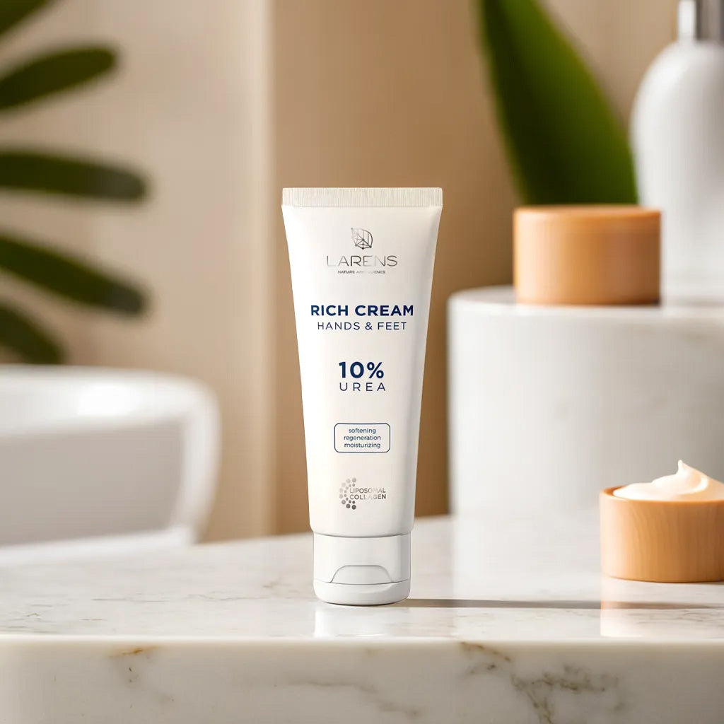 Rich Cream Hands & Feet formula is rich in selected active components regenerates and gives immediate relief for even very dry, rough and chapped skin. Its 10% concentration urea perfectly moisturizes and softens, however it does not excessively peel the skin.